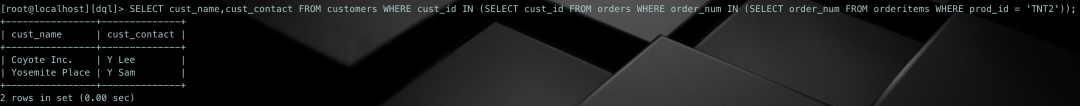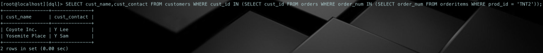 接下来我们继续深入,现在得到了订购物品TNT2的所有客户的ID。下一步是检索这些客户ID的客户信息。检索两列的SQL语句为: