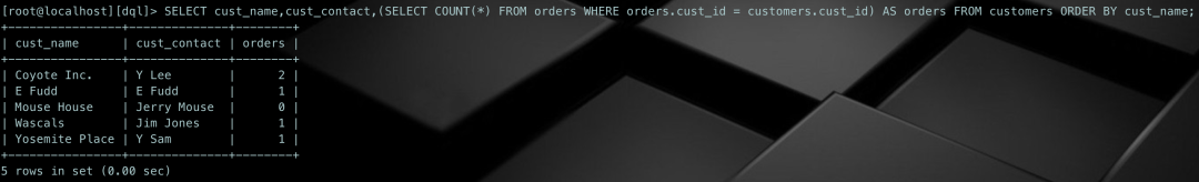 SELECT cust_name,cust_contact,(SELECT COUNT(*) FROM orders WHERE cust_id = cust_id) AS orders FROM customers ORDER BY cust_name;