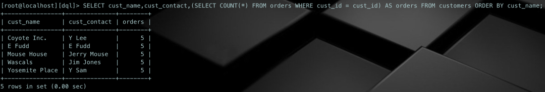 cust_name、cust_state和orders。orders是一个计算字段,它是由圆括号中的子查询建立的。该子查询对检索出的每个客户执行一次。在此例子中,该子查询执行了5次,因为检索出了5个客户。