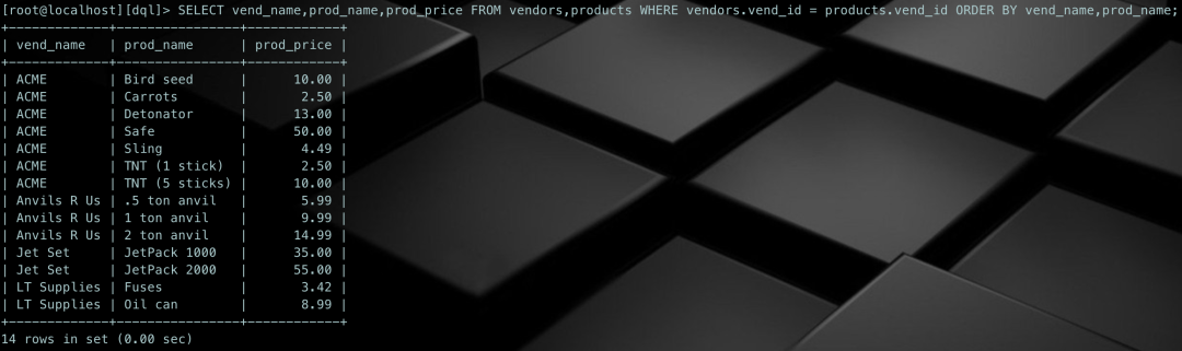 SELECT vend_name,prod_name,prod_price FROM vendors,products WHERE vendors.vend_id = products.vend_id ORDER BY vend_name,prod_name;