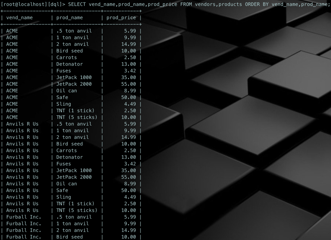 SELECT vend_name,prod_name,prod_price FROM vendors,products ORDER BY vend_name,prod_name;