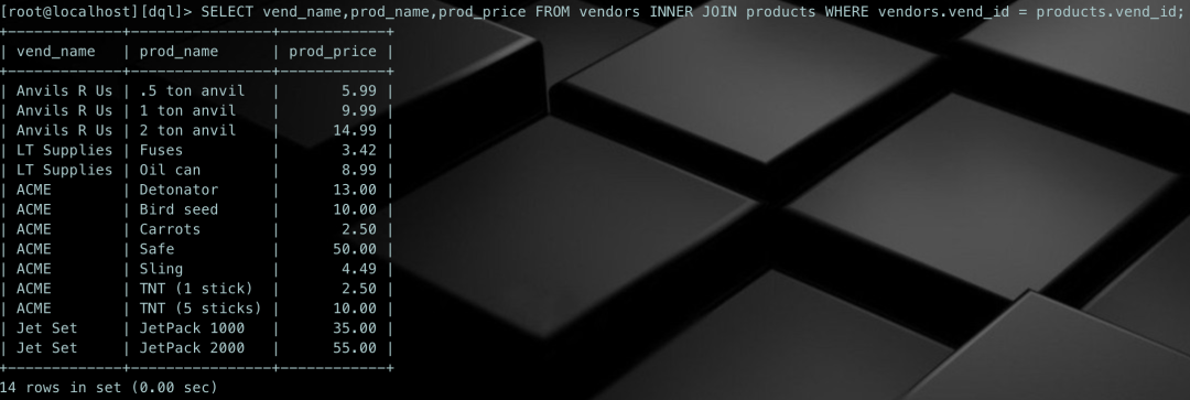 我们来考察一下此代码。SELECT语句与前面所有语句一样指定要检索的列。这里,最大的差别是所指定的两个列(prod_name和prod_price)在一个表中,而另一个列(vend_name)在另一个表中。