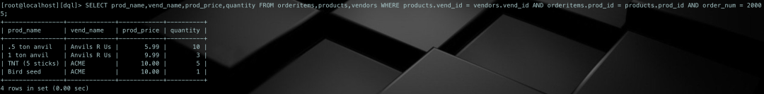 SELECT prod_name,vend_name,prod_price,quantity FROM orderitems,products,vendors WHERE products.vend_id = vendors.vend_id AND orderitems.prod_id = products.prod_id AND order_num = 20005;
