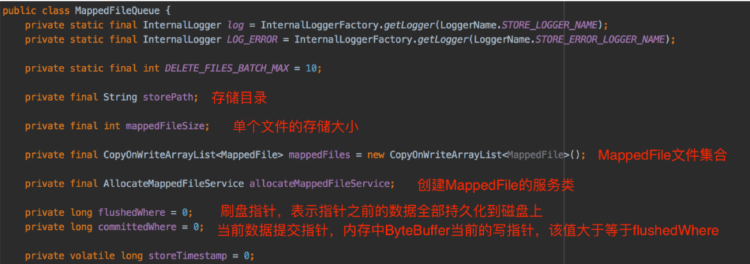 MappedFileQueue重要属性如下所示: