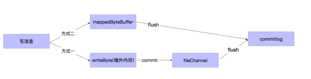 这种方式是直接创建 MappedFile 内存映射文件字节缓冲区mappedByteBuffer,将消息写入 mappedByteBuffer 再 flush。