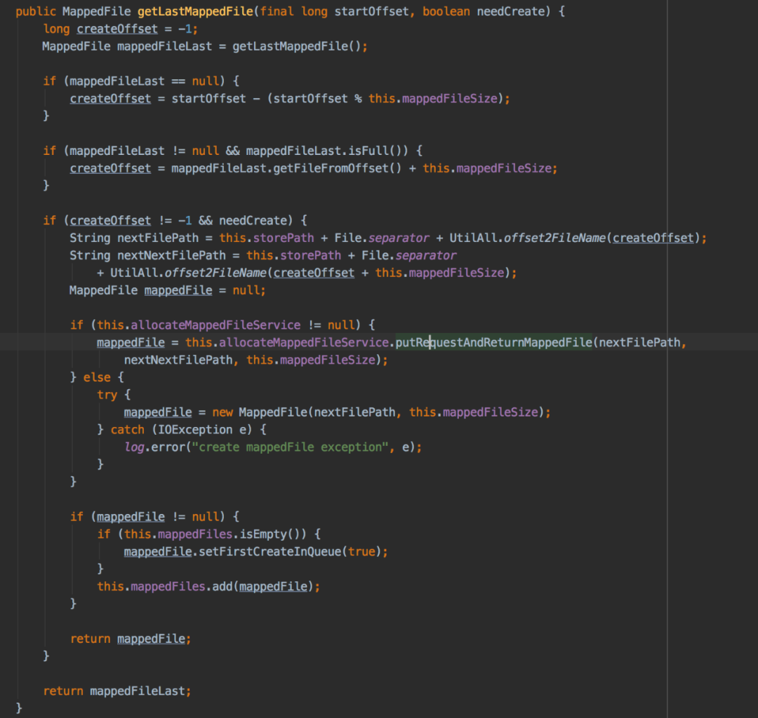 获取最新的mappedFile的方法是getLastMappedFile(final long startOffset, boolean needCreate),其实现逻辑如下: