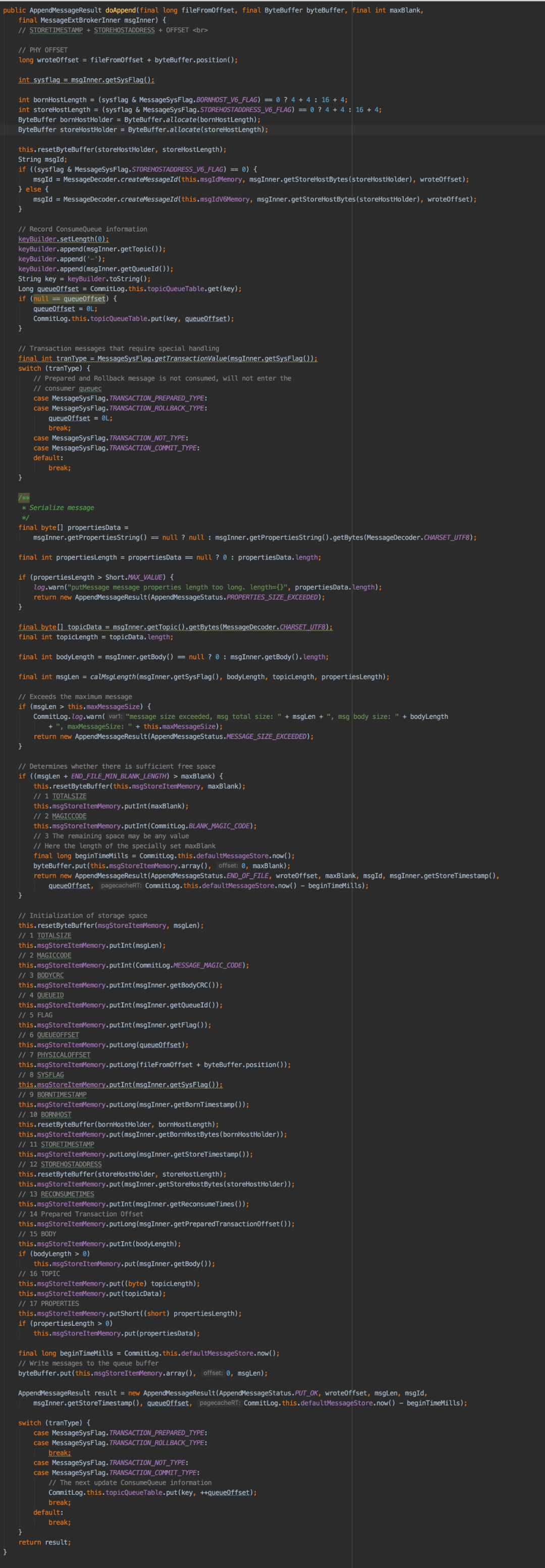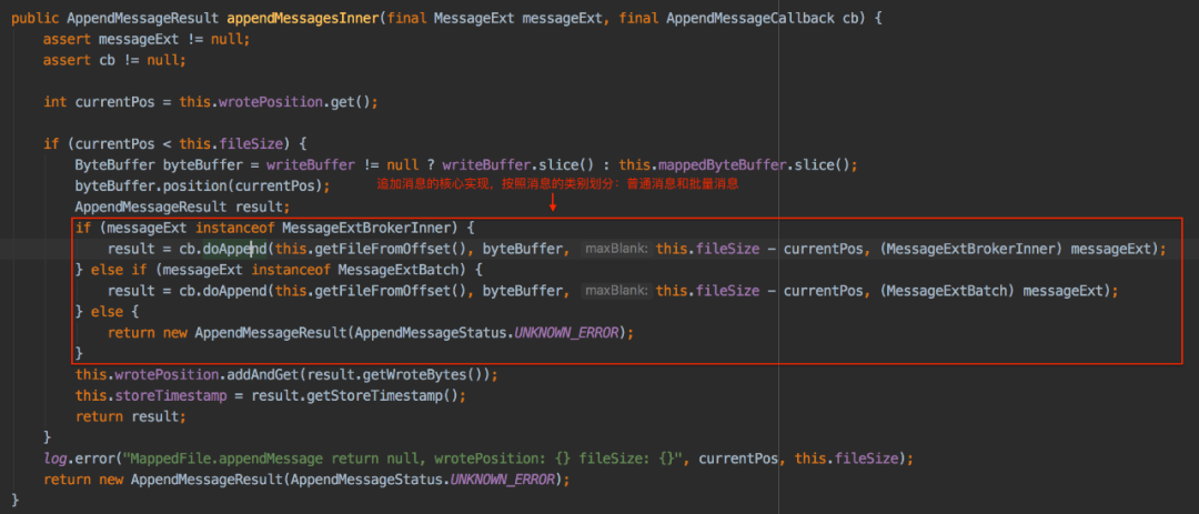 判断写指针的位置与文件大小的关系,如果写指针的位置小于文件大小则按照消息的类型(普通消息及批量消息)调用AppendMessageCallback的回调函数doAppend追加消息,doAppend方法是追加消息的核心实现,其实现逻辑是: