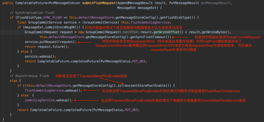 handleDiskFlush(AppendMessageResult result, PutMessageResult putMessageResult, MessageExt messageExt)的处理逻辑如下:首先会根据消息刷盘类型分为两类:同步和异步,然后不同的类型有不同的处理方式,这里需要注意异步刷盘的分支中还会再分为两种:启用TransientStorePoolEnable和不不启用TransientStorePoolEnable