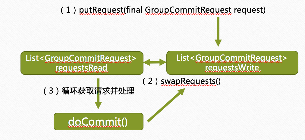 实现消息同步刷盘的服务是GroupCommitService,该服务是在broker启动时启动的,在GroupCommitService服务中有两个存放GroupCommitRequest的list,分别是requestsWrite和requestsRead,在handleDiskFlush方法中GroupCommitRequest被put到requestsWrite中,GroupCommitService服务会每10毫秒执行一次swapRequests()方法,该方法会交换requestsWrite和requestsRead中的请求,GroupCommitService服务在后台会一直执行doCommit()方法,这个方法会不断从requestsRead中获取GroupCommitRequest并执行flush操作,最后清空requestsRead。在 GroupCommitService中使用requestsWrite和requestsRead可以避免提交刷盘请求与消费刷盘请求的锁竞争。整个过程可以使用下图来表示: