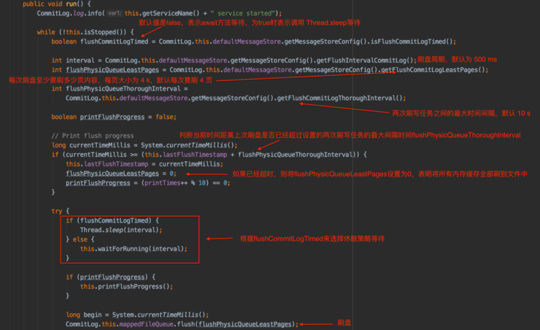 TransientStorePoolEnable为false时,是使用FlushRealTimeService服务来进行刷盘操作,该服务的核心逻辑如下:首先从配置文件中获取flushCommitLogTimed、flushIntervalCommitLog、flushPhysicQueueLeastPages和flushPhysicQueueThoroughInterval,计算距离上次刷盘的时间差,判断是否超过flushPhysicQueueThoroughInterval,如果超过了flushPhysicQueueThoroughInterval则本次刷盘将忽略flushPhysicQueueLeastPages,会将所有内存缓存的全部数据刷盘到文件中,最后会调用flush将内存中的数据写到磁盘并更新checkpoint文件中commitlog文件的更新时间戳。