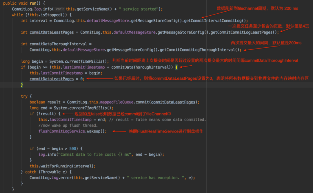 TransientStorePoolEnable为true时会先使用CommitRealTimeService来将writeBuffer中的数据提交到fileChannel中之后会唤醒FlushCommitLogService服务来进行刷盘操作,CommitRealTimeService服务的核心逻辑如下: