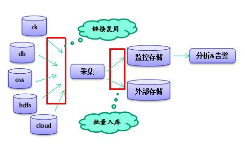 3、监控线程入库失败或延时,导致外部存储也掉点毛刺。采集同多个数据源和存储之间链接多为短链接,无法复用性能不高;