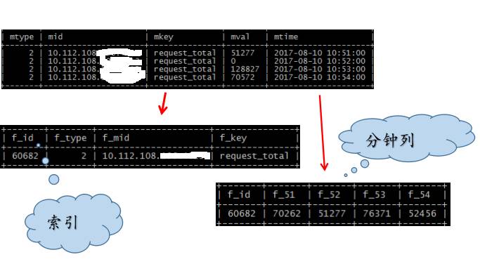 2、时间序列分钟级转到小时级的60列。时序数据为相同的指标在不同时间的取值序列。这种方式一方面可以减少数据量,减少索引量,另一方面也可以减少存储消耗;