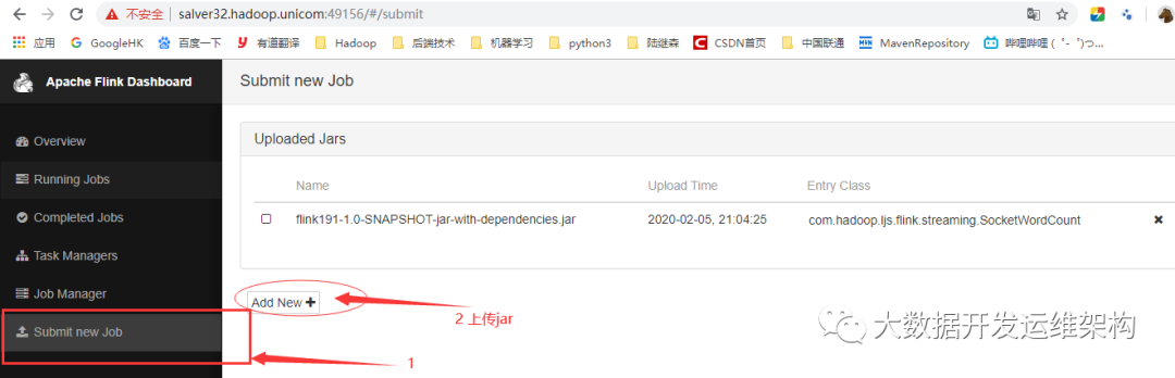 直接提交到flink在yarn中已启动的一个session中,从flink界面上传jar: