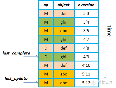简单起见,图中的数字就表示pglog里不同对象的版本。
