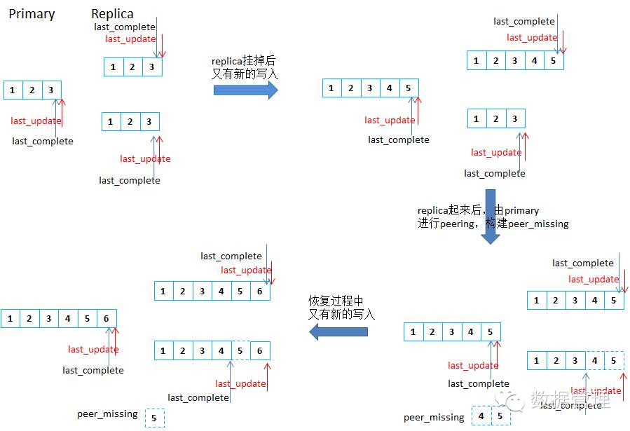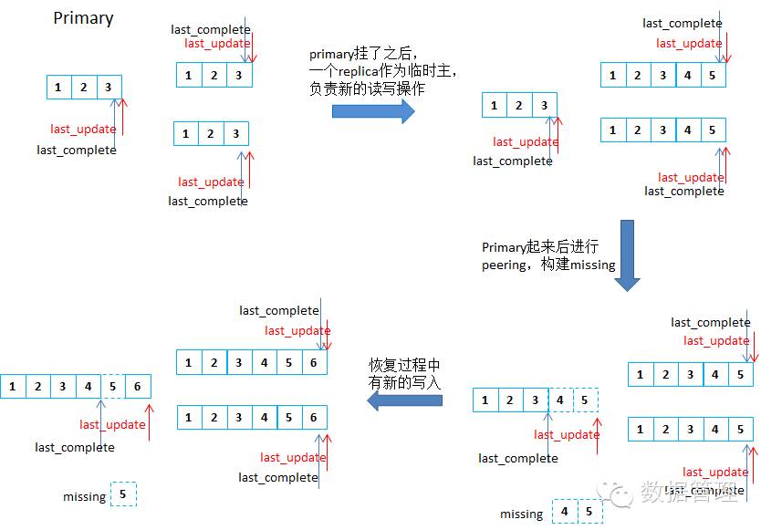 5)当有新的写入时,仍然是由Primary负责处理,会更新last_update,副本上会同时更新last_complete,与此同时,Primary会进行恢复,就是从其他副本上拉取对象数据到自己这里进行恢复,每当恢复完一个时,就会更新自己的last_complete(会持久化的),当所有对象都恢复完成后,last_complete就会追上last_update了。