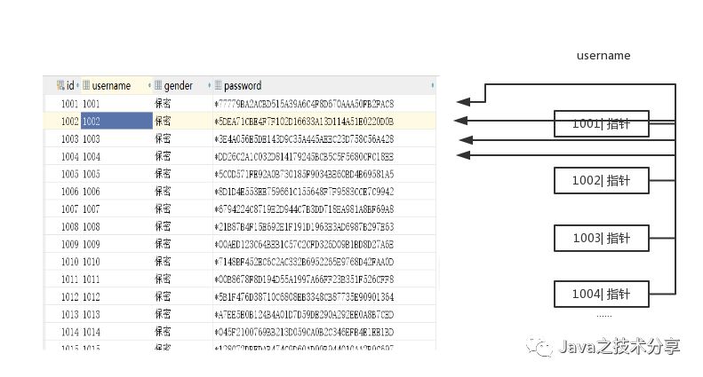 索引是可以对记录集合的字段进行排序的方法。在一张表中给一个字段创建一个索引,将创建另外一个数据结构,这个数据结构包含该字段的数值以及指向这一列的指针,然后创建完之后会对这个索引进行排序。如下图: