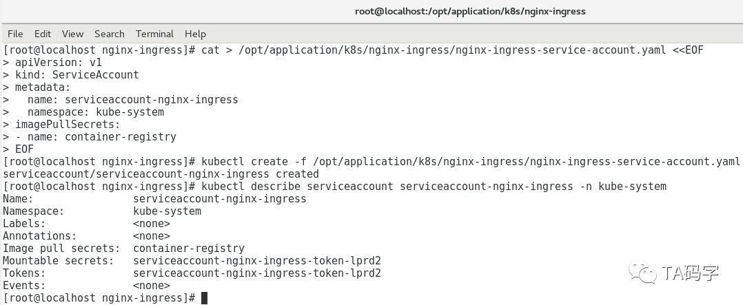 cat > opt/application/k8s/nginx-ingress/nginx-ingress-service-account.yaml <<EOFapiVersion: v1kind: ServiceAccountmetadata:name: serviceaccount-nginx-ingressnamespace: kube-systemimagePullSecrets:- name: container-registryEOFkubectl create -f opt/application/k8s/nginx-ingress/nginx-ingress-service-account.yamlkubectl describe serviceaccount serviceaccount-nginx-ingress -n kube-system