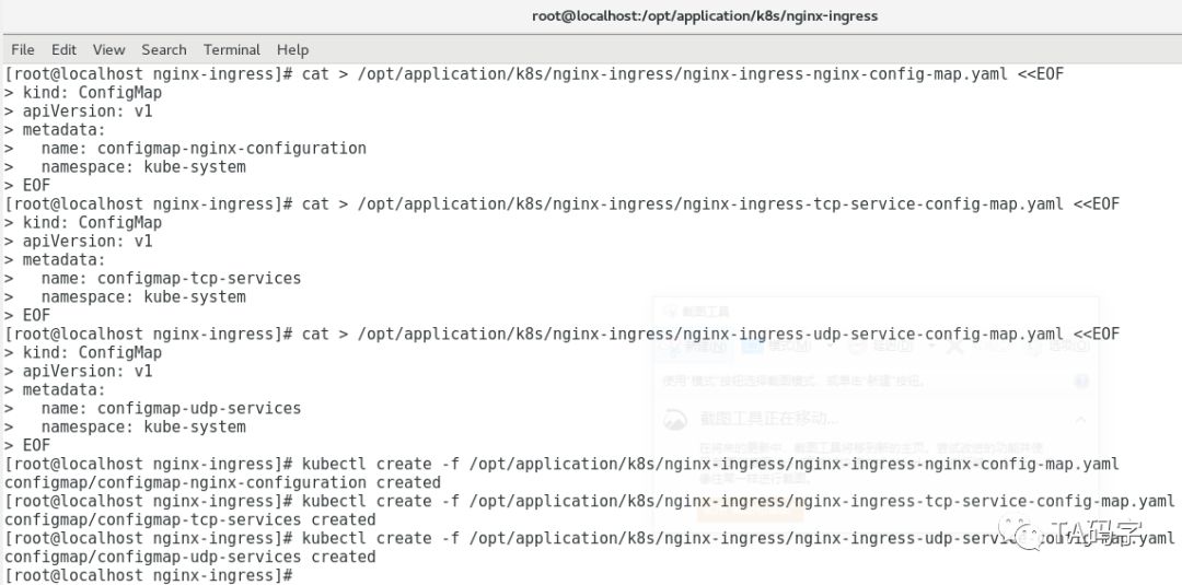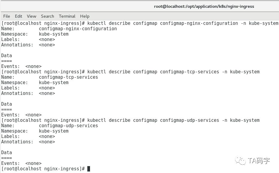 cat > opt/application/k8s/nginx-ingress/nginx-ingress-nginx-config-map.yaml <<EOFkind: ConfigMapapiVersion: v1metadata:name: configmap-nginx-configurationnamespace: kube-systemEOFcat > opt/application/k8s/nginx-ingress/nginx-ingress-tcp-service-config-map.yaml <<EOFkind: ConfigMapapiVersion: v1metadata:name: configmap-tcp-servicesnamespace: kube-systemEOFcat > opt/application/k8s/nginx-ingress/nginx-ingress-udp-service-config-map.yaml <<EOFkind: ConfigMapapiVersion: v1metadata:name: configmap-udp-servicesnamespace: kube-systemEOFkubectl create -f opt/application/k8s/nginx-ingress/nginx-ingress-nginx-config-map.yamlkubectl create -f opt/application/k8s/nginx-ingress/nginx-ingress-tcp-service-config-map.yamlkubectl create -f opt/application/k8s/nginx-ingress/nginx-ingress-udp-service-config-map.yamlkubectl describe configmap configmap-nginx-configuration -n kube-systemkubectl describe configmap configmap-tcp-services -n kube-systemkubectl describe configmap configmap-udp-services -n kube-system