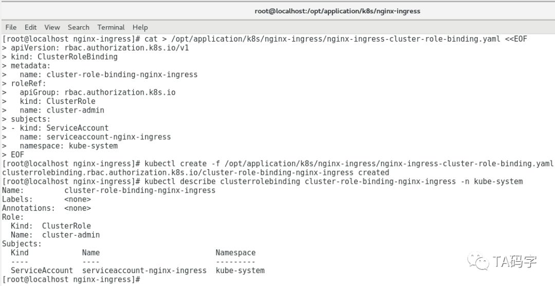 cat > /opt/application/k8s/nginx-ingress/nginx-ingress-cluster-role-binding.yaml <<EOFapiVersion: rbac.authorization.k8s.io/v1kind: ClusterRoleBindingmetadata:name: cluster-role-binding-nginx-ingressroleRef:apiGroup: rbac.authorization.k8s.iokind: ClusterRolename: cluster-adminsubjects:- kind: ServiceAccountname: serviceaccount-nginx-ingressnamespace: kube-systemEOFkubectl create -f opt/application/k8s/nginx-ingress/nginx-ingress-cluster-role-binding.yamlkubectl describe clusterrolebinding cluster-role-binding-nginx-ingress -n kube-system