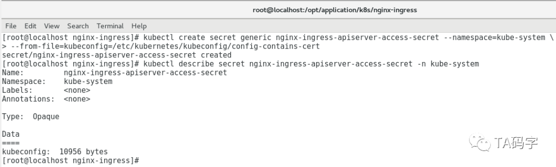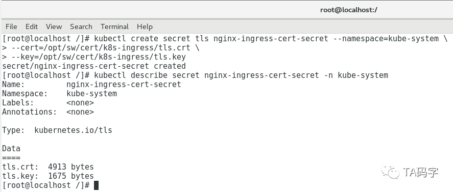 kubectl create secret tls nginx-ingress-cert-secret --namespace=kube-system \--cert=/opt/sw/cert/k8s-ingress/tls.crt \--key=/opt/sw/cert/k8s-ingress/tls.keykubectl describe secret nginx-ingress-cert-secret -n kube-system