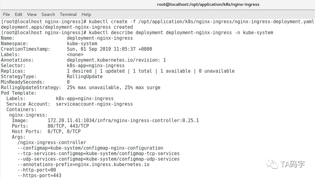 cat > /opt/application/k8s/nginx-ingress/nginx-ingress-deployment.yaml <<EOFapiVersion: apps/v1kind: Deploymentmetadata:name: deployment-nginx-ingressnamespace: kube-systemspec:replicas: 1selector:matchLabels:k8s-app: nginx-ingresstemplate:metadata:labels:k8s-app: nginx-ingressspec:serviceAccountName: serviceaccount-nginx-ingresscontainers:- name: nginx-ingressimage: 172.20.11.41:1034/infra/nginx-ingress-controller:0.25.1imagePullPolicy: IfNotPresentargs:- /nginx-ingress-controller- --configmap=kube-system/configmap-nginx-configuration- --tcp-services-configmap=kube-system/configmap-tcp-services- --udp-services-configmap=kube-system/configmap-udp-services- --annotations-prefix=nginx.ingress.kubernetes.io- --http-port=80- --https-port=443- --healthz-port=10254- --health-check-path=/healthz- --health-check-timeout=15- --alsologtostderr- --default-ssl-certificate=kube-system/nginx-ingress-cert-secret- --kubeconfig=/config/kubeconfigsecurityContext:allowPrivilegeEscalation: truecapabilities:drop:- ALLadd:- NET_BIND_SERVICE# www-data -> 33runAsUser: 33volumeMounts:- name: kube-apiserver-access-configmountPath: /configenv:- name: POD_NAMEvalueFrom:fieldRef:fieldPath: metadata.name- name: POD_NAMESPACEvalueFrom:fieldRef:fieldPath: metadata.namespaceports:- name: httpcontainerPort: 80- name: httpscontainerPort: 443livenessProbe:failureThreshold: 3httpGet:path: /healthzport: 10254scheme: HTTPinitialDelaySeconds: 60periodSeconds: 10successThreshold: 1timeoutSeconds: 15readinessProbe:failureThreshold: 3httpGet:path: /healthzport: 10254scheme: HTTPperiodSeconds: 10successThreshold: 1timeoutSeconds: 15volumes:- name: kube-apiserver-access-configsecret:secretName: nginx-ingress-apiserver-access-secretEOFkubectl create -f /opt/application/k8s/nginx-ingress/nginx-ingress-deployment.yamlkubectl describe deployment deployment-nginx-ingress -n kube-system