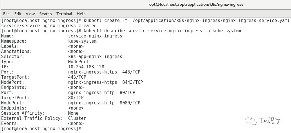 cat > /opt/application/k8s/nginx-ingress/nginx-ingress-service.yaml <<EOFapiVersion: v1kind: Servicemetadata:name: service-nginx-ingressnamespace: kube-systemspec:selector:k8s-app: nginx-ingresstype: NodePortports:- name: nginx-ingress-httpsnodePort: 8443port: 443targetPort: 443protocol: TCP- name: nginx-ingress-httpnodePort: 8080port: 80targetPort: 80protocol: TCPEOFkubectl create -f /opt/application/k8s/nginx-ingress/nginx-ingress-service.yamlkubectl describe service service-nginx-ingress -n kube-system