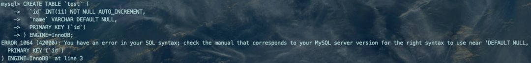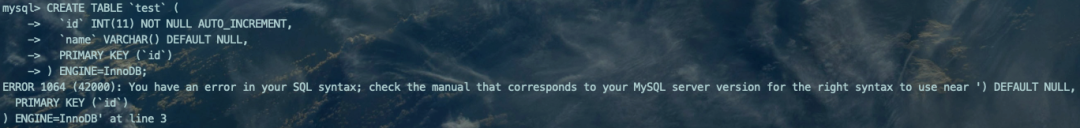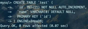 CREATE TABLE `test` ( `id` INT(11) NOT NULL AUTO_INCREMENT, `name` VARCHAR DEFAULT NULL, PRIMARY KEY (`id`)) ENGINE=InnoDB;