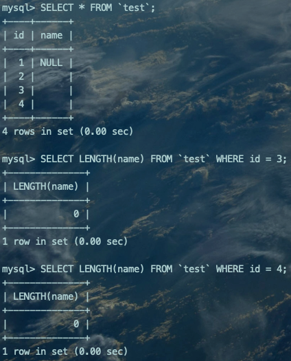 SELECT * FROM `test`;SELECT LENGTH(name) FROM `test` WHERE id = 3;SELECT LENGTH(name) FROM `test` WHERE id = 4;