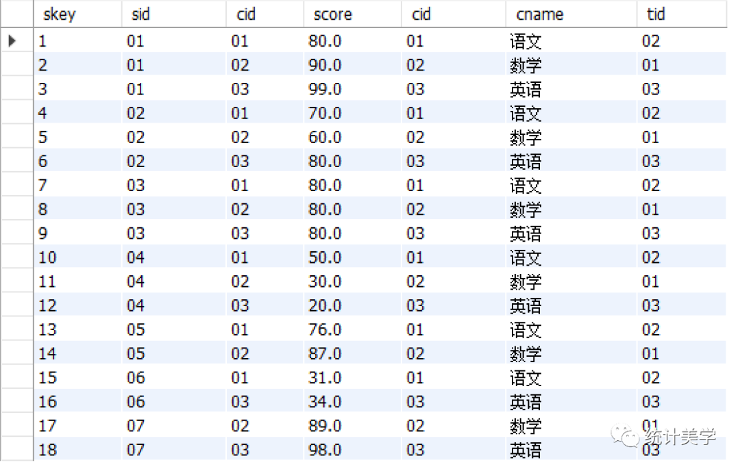 -- 切换数据库并查看sc和course表USE school;SELECT * FROM sc LEFT JOIN course ON sc.cid = course.CId;