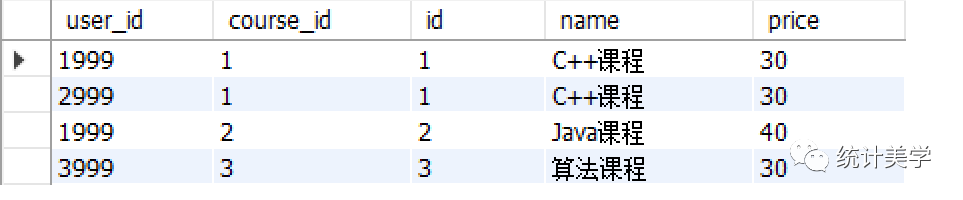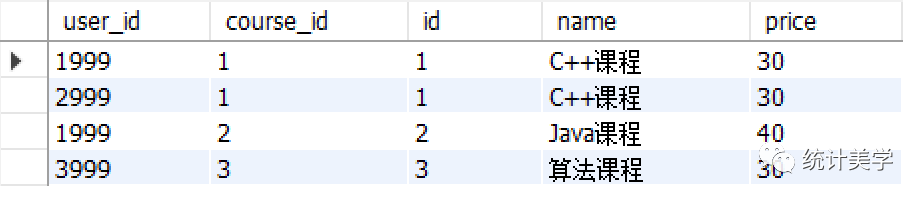 -- 切换数据库并查看sale和course表USE jianxingjinke;SELECT * FROM sale LEFT JOIN course ON sale.course_id = course.id;