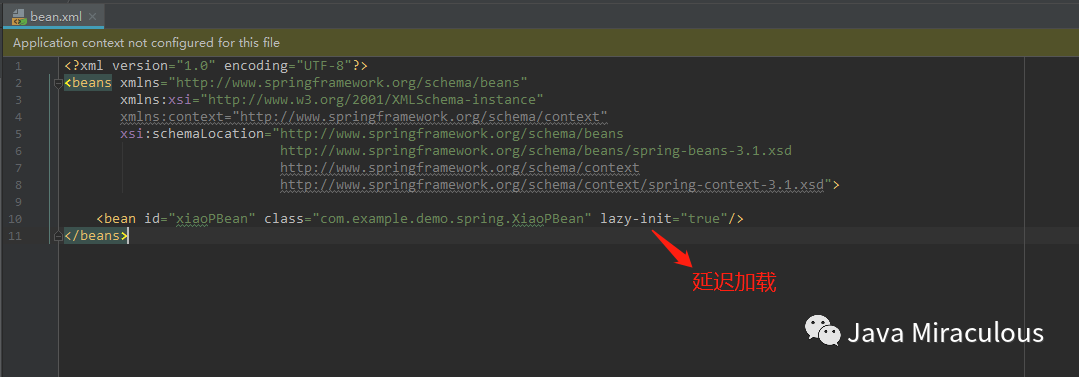 <?xml version="1.0" encoding="UTF-8"?><beans xmlns="http://www.springframework.org/schema/beans"xmlns:xsi="http://www.w3.org/2001/XMLSchema-instance"xmlns:context="http://www.springframework.org/schema/context"xsi:schemaLocation="http://www.springframework.org/schema/beanshttp://www.springframework.org/schema/beans/spring-beans-3.1.xsdhttp://www.springframework.org/schema/contexthttp://www.springframework.org/schema/context/spring-context-3.1.xsd"><bean id="xiaoPBean" class="com.example.demo.spring.XiaoPBean"/></beans>