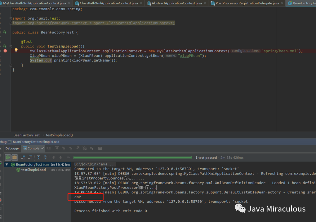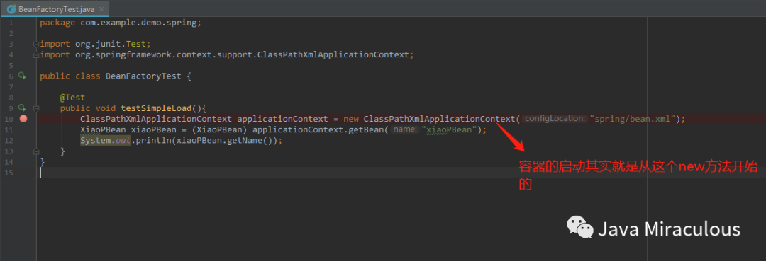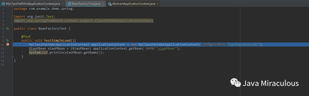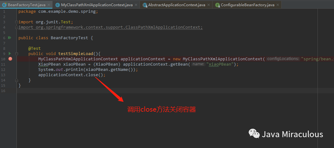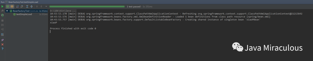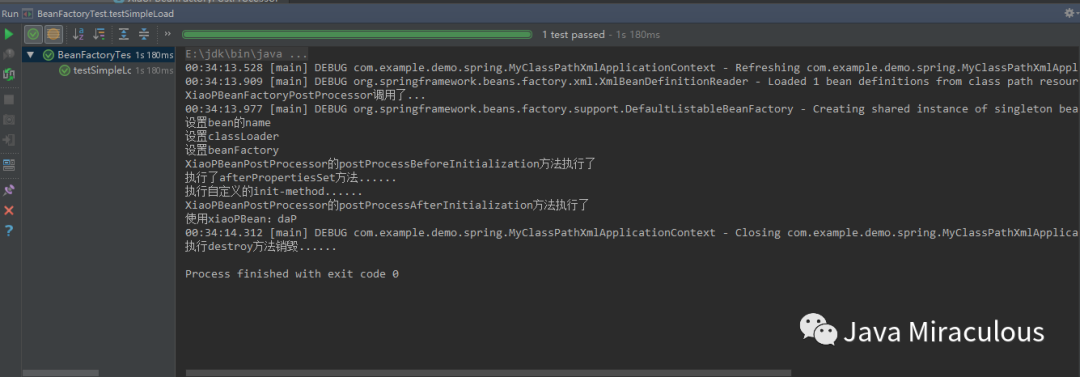 package com.example.demo.spring;import org.junit.Test;public class BeanFactoryTest {@Testpublic void testSimpleLoad(){MyClassPathXmlApplicationContext applicationContext = new MyClassPathXmlApplicationContext("spring/bean.xml");XiaoPBean xiaoPBean = (XiaoPBean) applicationContext.getBean("xiaoPBean");System.out.println("使用xiaoPBean:" + xiaoPBean.getName());applicationContext.close();}}