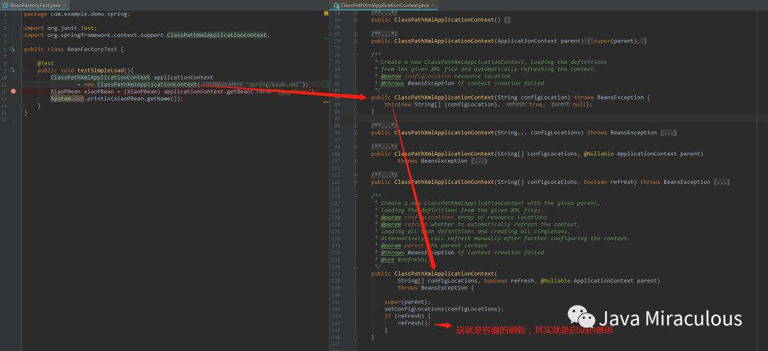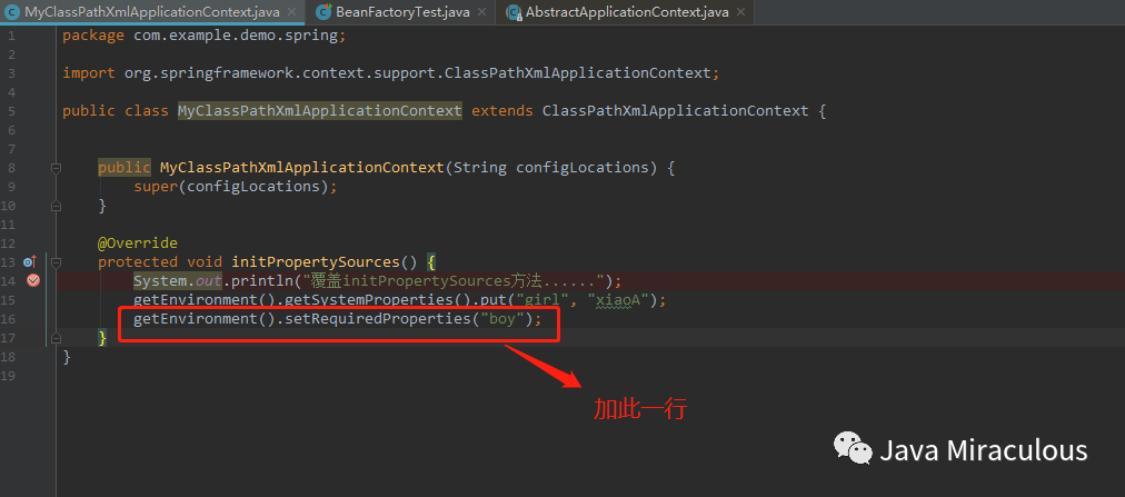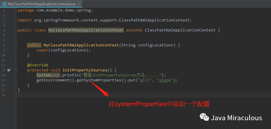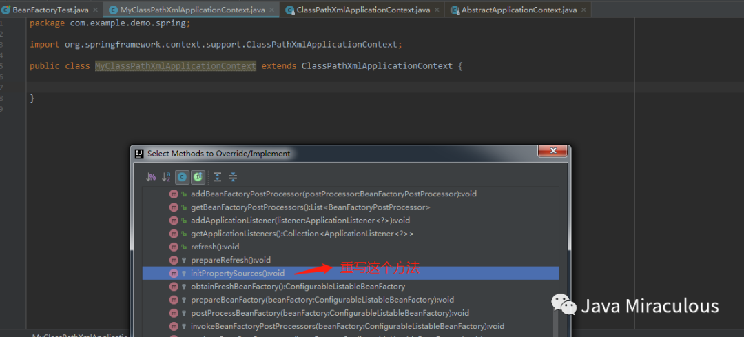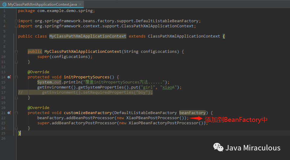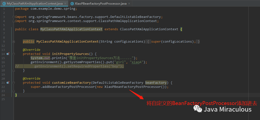 package com.example.demo.spring;import org.springframework.beans.factory.support.DefaultListableBeanFactory;import org.springframework.context.support.ClassPathXmlApplicationContext;public class MyClassPathXmlApplicationContext extends ClassPathXmlApplicationContext {public MyClassPathXmlApplicationContext(String configLocations) {super(configLocations);}@Overrideprotected void customizeBeanFactory(DefaultListableBeanFactory beanFactory) {beanFactory.addBeanPostProcessor(new XiaoPBeanPostProcessor());super.addBeanFactoryPostProcessor(new XiaoPBeanFactoryPostProcessor());}}