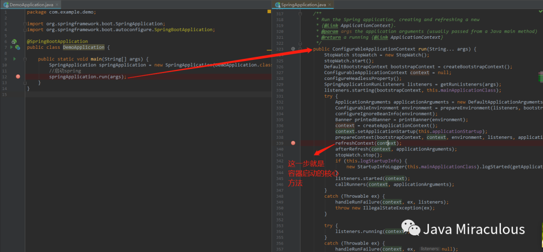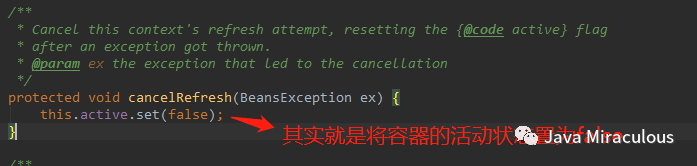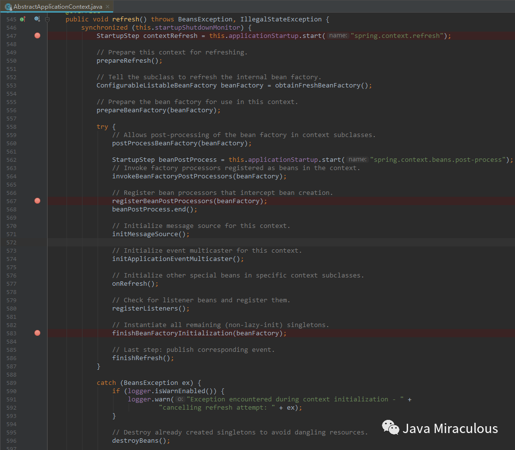 @Overridepublic void refresh() throws BeansException, IllegalStateException {synchronized (this.startupShutdownMonitor) {StartupStep contextRefresh = this.applicationStartup.start("spring.context.refresh");// 1、刷新前的准备prepareRefresh();// 2、告诉子类刷新内部 bean 工厂ConfigurableListableBeanFactory beanFactory = obtainFreshBeanFactory();// 3、准备在此上下文中使用的 bean 工厂prepareBeanFactory(beanFactory);try {// 4、允许在上下文子类中对 bean 工厂进行后处理postProcessBeanFactory(beanFactory);StartupStep beanPostProcess = this.applicationStartup.start("spring.context.beans.post-process");// 5、调用在上下文中注册为 bean 的工厂处理器invokeBeanFactoryPostProcessors(beanFactory);// 6、注册拦截 bean 创建的 bean 处理器registerBeanPostProcessors(beanFactory);beanPostProcess.end();// 7、初始化此上下文的消息源initMessageSource();// 8、为此上下文初始化事件多播器initApplicationEventMulticaster();// 9、初始化特定上下文子类中的其他特殊 bean。onRefresh();// 10、检查监听器 bean 并注册它们registerListeners();// 11、实例化所有剩余的(非延迟初始化)单例finishBeanFactoryInitialization(beanFactory);// 12、最后一步:发布相应的事件finishRefresh();}catch (BeansException ex) {if (logger.isWarnEnabled()) {logger.warn("Exception encountered during context initialization - " +"cancelling refresh attempt: " + ex);}// 13、销毁已经创建的单例以避免悬空资源destroyBeans();// 14、重置“活动”标志cancelRefresh(ex);// 15、将异常传播给调用者throw ex;}finally {// 16、重置 Spring 核心中的常见内省缓存,因为我们可能不再需要单例 bean 的元数据......resetCommonCaches();contextRefresh.end();}}}