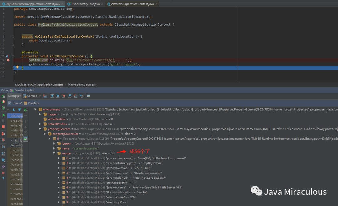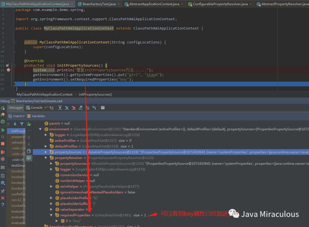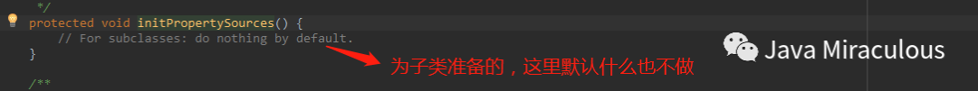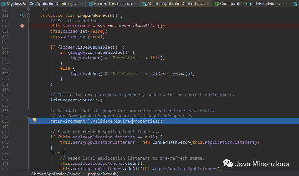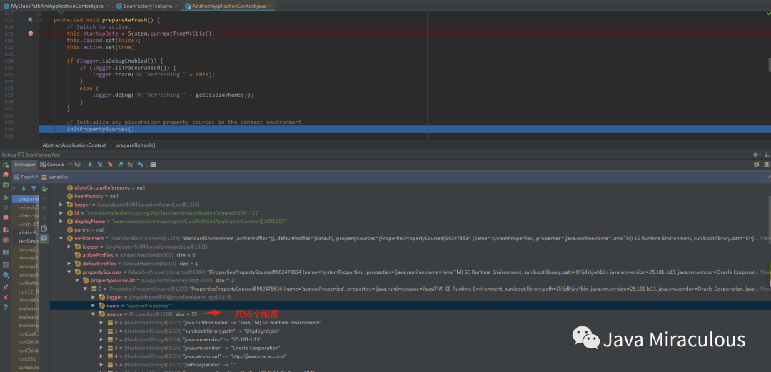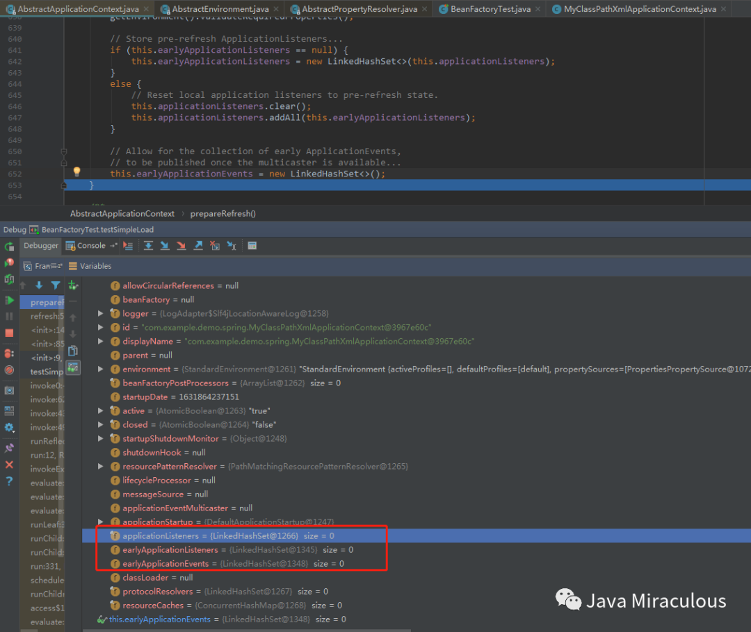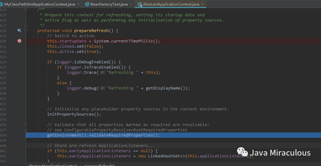 protected void prepareRefresh() {// 设置当前时间为容器的启动时间this.startupDate = System.currentTimeMillis();// 将关闭状态设置为false,因为要开始启动嘛this.closed.set(false);// 将激活状态设置为truethis.active.set(true);//打印日志if (logger.isDebugEnabled()) {if (logger.isTraceEnabled()) {logger.trace("Refreshing " + this);}else {logger.debug("Refreshing " + getDisplayName());}}// 1.1、初始化Environment的propertySources属性initPropertySources();// 1.2、验证所有标记为必需的属性都是可解析的:请参阅 ConfigurablePropertyResolver#setRequiredPropertiesgetEnvironment().validateRequiredProperties();// 1.3、存储预刷新应用程序监听器...if (this.earlyApplicationListeners == null) {this.earlyApplicationListeners = new LinkedHashSet<>(this.applicationListeners);}else {// 1.4、将本地应用程序监听器重置为刷新前状态this.applicationListeners.clear();this.applicationListeners.addAll(this.earlyApplicationListeners);}// 1.5、允许收集早期的 ApplicationEvents,一旦多播器可用就发布......this.earlyApplicationEvents = new LinkedHashSet<>();}