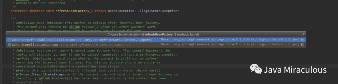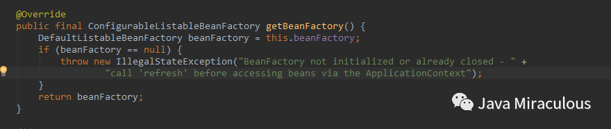 /*** Tell the subclass to refresh the internal bean factory.* @return the fresh BeanFactory instance* @see #refreshBeanFactory()* @see #getBeanFactory()*/protected ConfigurableListableBeanFactory obtainFreshBeanFactory() {// 1、刷新Bean工厂refreshBeanFactory();// 2、返回Bean工厂return getBeanFactory();}