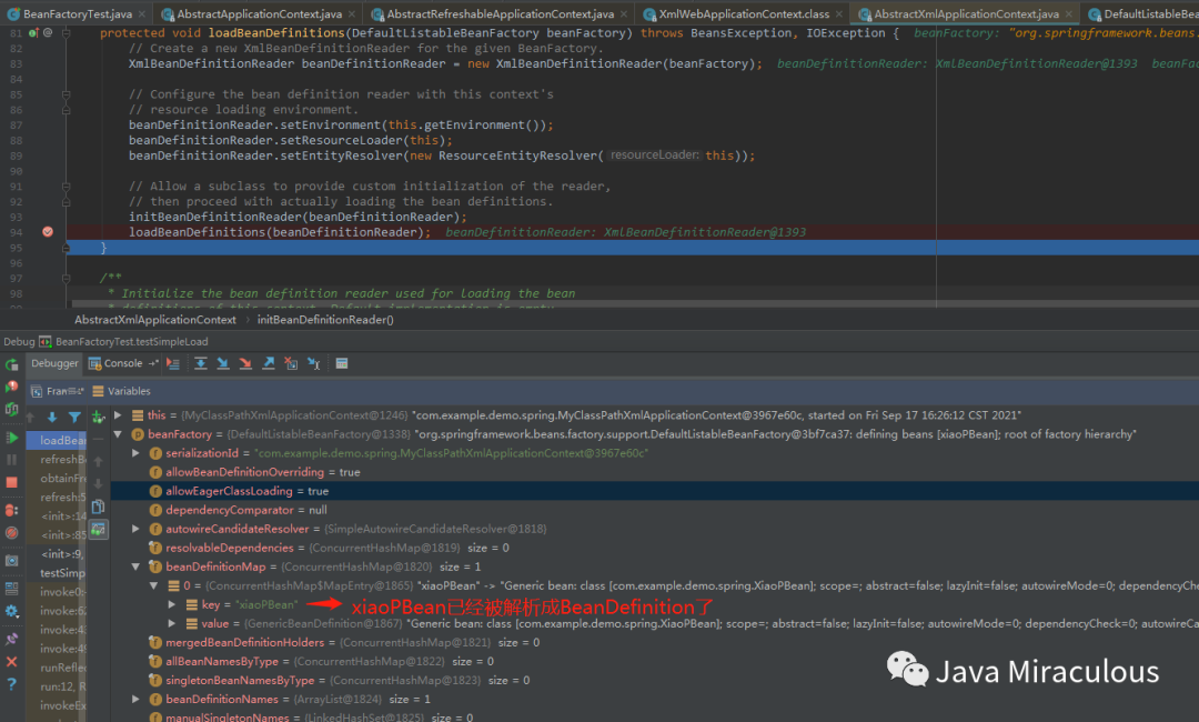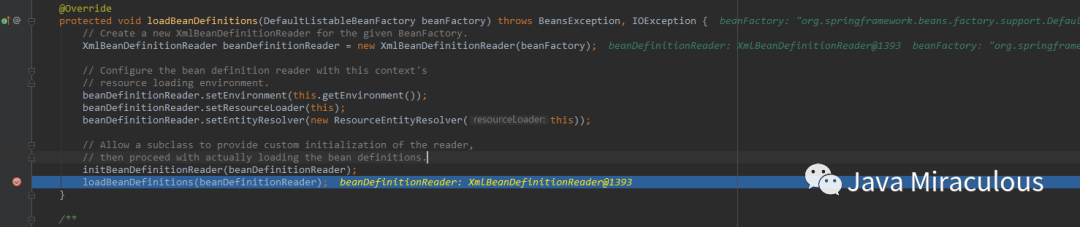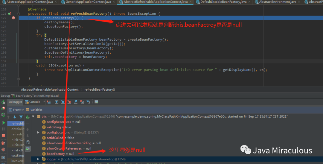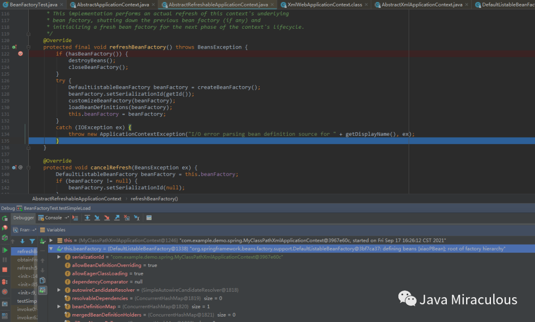 @Overrideprotected final void refreshBeanFactory() throws BeansException {// 1、当前Bean工厂是否存在if (hasBeanFactory()) {// 如果存在,就销毁工厂里的单例beandestroyBeans();// 关闭Bean工厂closeBeanFactory();}try {// 2、新创建一个Bean工厂DefaultListableBeanFactory beanFactory = createBeanFactory();// 3、给Bean工厂设置序列化idbeanFactory.setSerializationId(getId());// 4、给Bean工厂做定制customizeBeanFactory(beanFactory);// 5、加载Bean定义信息loadBeanDefinitions(beanFactory);// 6、将新创建的Bean工厂设置为当前Bean工厂this.beanFactory = beanFactory;}catch (IOException ex) {throw new ApplicationContextException("I/O error parsing bean definition source for " + getDisplayName(), ex);}}