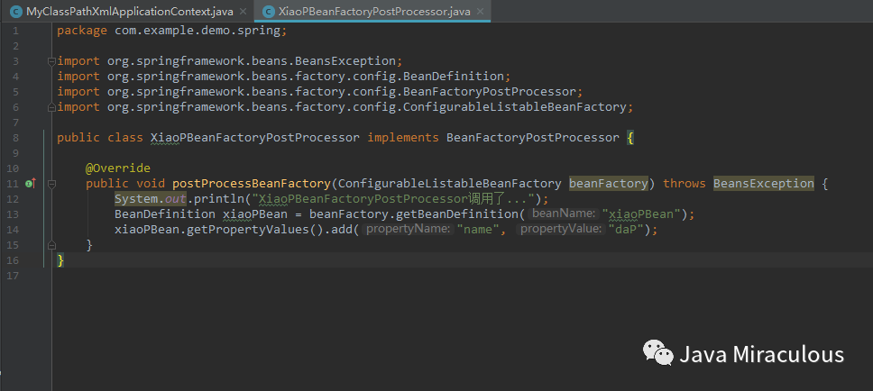 package com.example.demo.spring;import org.springframework.beans.BeansException;import org.springframework.beans.factory.config.BeanDefinition;import org.springframework.beans.factory.config.BeanFactoryPostProcessor;import org.springframework.beans.factory.config.ConfigurableListableBeanFactory;public class XiaoPBeanFactoryPostProcessor implements BeanFactoryPostProcessor {@Overridepublic void postProcessBeanFactory(ConfigurableListableBeanFactory beanFactory) throws BeansException {System.out.println("XiaoPBeanFactoryPostProcessor调用了...");BeanDefinition xiaoPBean = beanFactory.getBeanDefinition("xiaoPBean");xiaoPBean.getPropertyValues().add("name", "daP");}}