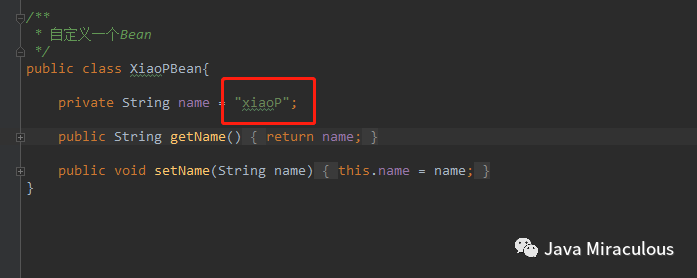 package com.example.demo.spring;/*** 自定义一个Bean*/public class XiaoPBean {private String name = "xiaoP";public String getName() {return name;}public void setName(String name) {this.name = name;}}