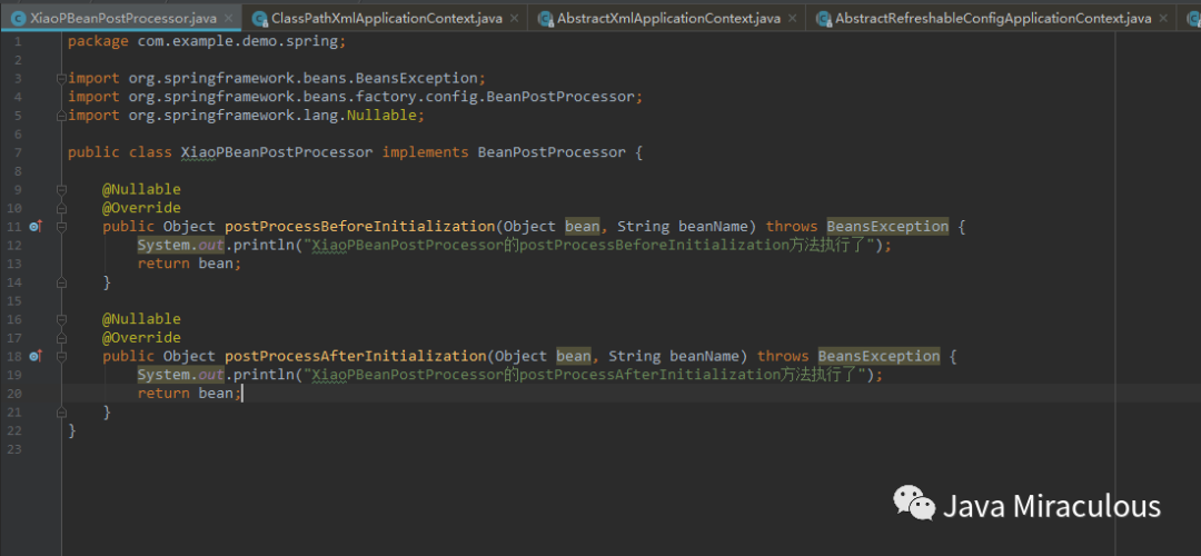 package com.example.demo.spring;import org.springframework.beans.BeansException;import org.springframework.beans.factory.config.BeanPostProcessor;import org.springframework.lang.Nullable;public class XiaoPBeanPostProcessor implements BeanPostProcessor {@Nullable@Overridepublic Object postProcessBeforeInitialization(Object bean, String beanName) throws BeansException {System.out.println("XiaoPBeanPostProcessor的postProcessBeforeInitialization方法执行了");return bean;}@Nullable@Overridepublic Object postProcessAfterInitialization(Object bean, String beanName) throws BeansException {System.out.println("XiaoPBeanPostProcessor的postProcessAfterInitialization方法执行了");return bean;}}
