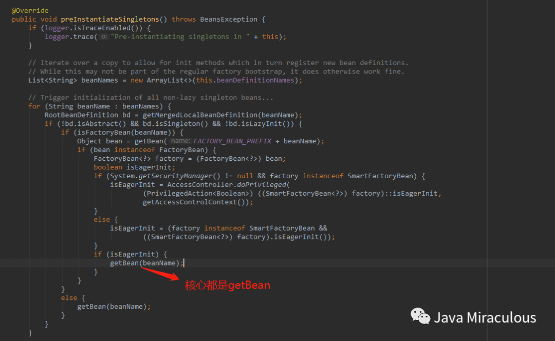 protected void finishBeanFactoryInitialization(ConfigurableListableBeanFactory beanFactory) {// 初始化此容器的转换器,转换器的职责是处理通过配置给Bean实例成员变量赋值的时候的类型转换工作if (beanFactory.containsBean(CONVERSION_SERVICE_BEAN_NAME) &&beanFactory.isTypeMatch(CONVERSION_SERVICE_BEAN_NAME, ConversionService.class)) {beanFactory.setConversionService(beanFactory.getBean(CONVERSION_SERVICE_BEAN_NAME, ConversionService.class));}// 如果没有注册过bean后置处理器post-processor,则注册默认的解析器,(例如主要用于解析properties文件的PropertyPlaceholderConfigurer// ),@value注解或在xml中使用${}的方式进行环境相关的配置if (!beanFactory.hasEmbeddedValueResolver()) {beanFactory.addEmbeddedValueResolver(strVal -> getEnvironment().resolvePlaceholders(strVal));}// AOP分为三种方式:编译期织入、类加载期织入和运行期织入,LoadTimeWeaving属于第二种,主要通过JVM进行织入,先初始化LoadTimeWeaverAware// bean,以便尽早注册它们的transformersString[] weaverAwareNames = beanFactory.getBeanNamesForType(LoadTimeWeaverAware.class, false, false);for (String weaverAwareName : weaverAwareNames) {getBean(weaverAwareName);}// 停止使用临时类加载器进行类型匹配beanFactory.setTempClassLoader(null);// 允许缓存所有bean定义元数据,不希望有进一步的更改beanFactory.freezeConfiguration();// 实例化所有剩余的(non-lazy-init非延时加载的)单例beanFactory.preInstantiateSingletons();}
