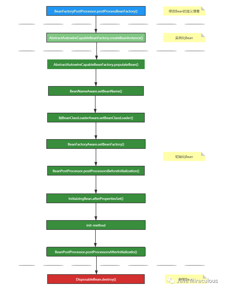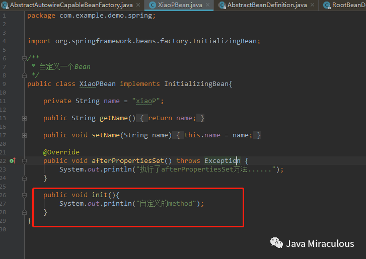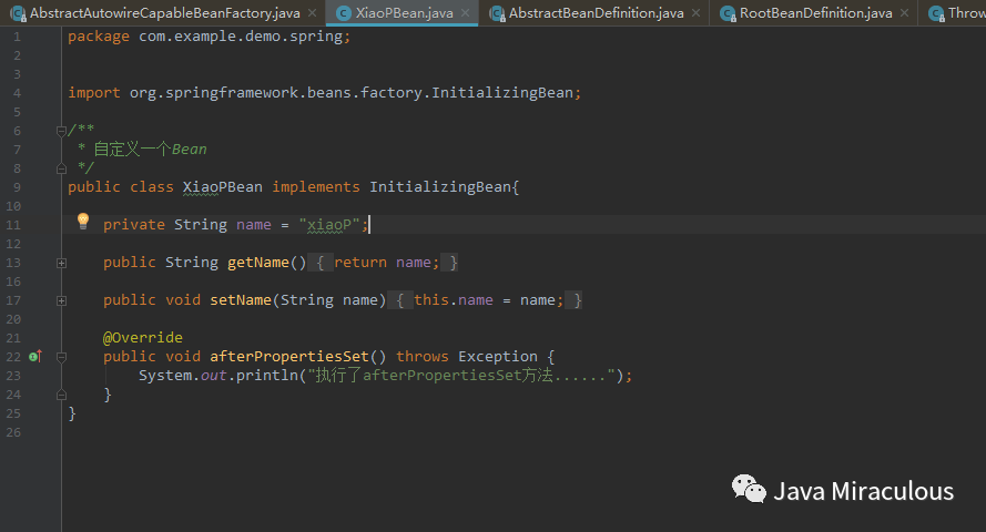 package com.example.demo.spring;import org.springframework.beans.BeansException;import org.springframework.beans.factory.*;/*** 自定义一个Bean*/public class XiaoPBean implements BeanNameAware, BeanClassLoaderAware, BeanFactoryAware, InitializingBean, DisposableBean {private String name = "xiaoP";public String getName() {return name;}public void setName(String name) {this.name = name;}@Overridepublic void afterPropertiesSet() throws Exception {System.out.println("执行了afterPropertiesSet方法......");}public void init(){System.out.println("执行自定义的init-method......");}@Overridepublic void destroy() throws Exception {System.out.println("执行destroy方法销毁......");}@Overridepublic void setBeanClassLoader(ClassLoader classLoader) {System.out.println("设置classLoader");}@Overridepublic void setBeanFactory(BeanFactory beanFactory) throws BeansException {System.out.println("设置beanFactory");}@Overridepublic void setBeanName(String name) {System.out.println("设置bean的name");}}