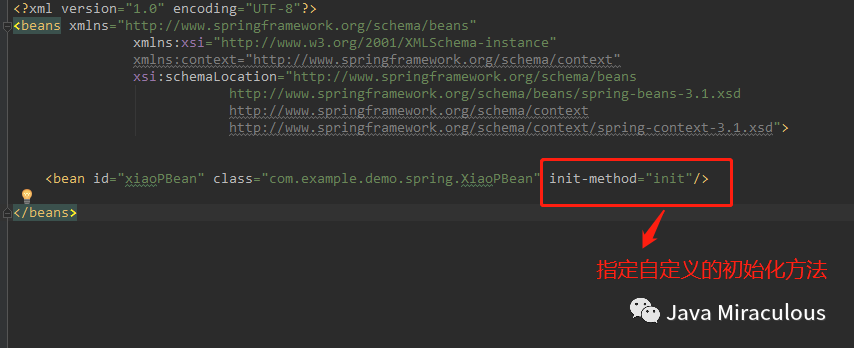 <?xml version="1.0" encoding="UTF-8"?><beans xmlns="http://www.springframework.org/schema/beans"xmlns:xsi="http://www.w3.org/2001/XMLSchema-instance"xmlns:context="http://www.springframework.org/schema/context"xsi:schemaLocation="http://www.springframework.org/schema/beanshttp://www.springframework.org/schema/beans/spring-beans-3.1.xsdhttp://www.springframework.org/schema/contexthttp://www.springframework.org/schema/context/spring-context-3.1.xsd"><bean id="xiaoPBean" class="com.example.demo.spring.XiaoPBean" init-method="init"/></beans>