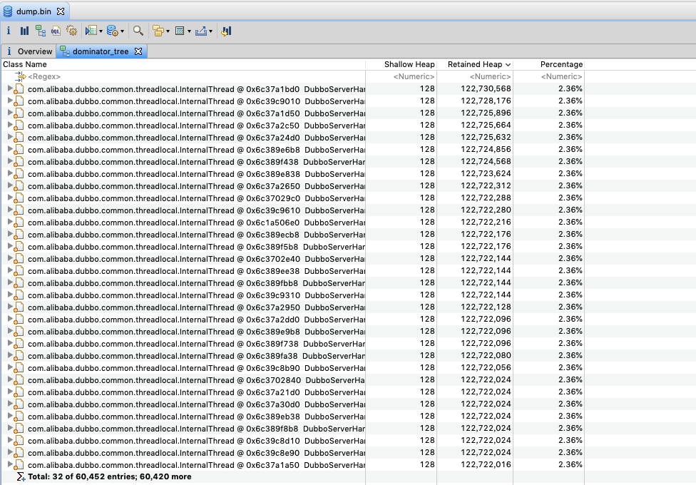 从dump文件可以看到dubbo的线程每个都占用了2%的内存,该应用设置了200个线程,理论上已经把内存撑爆了。展开一个线程看看