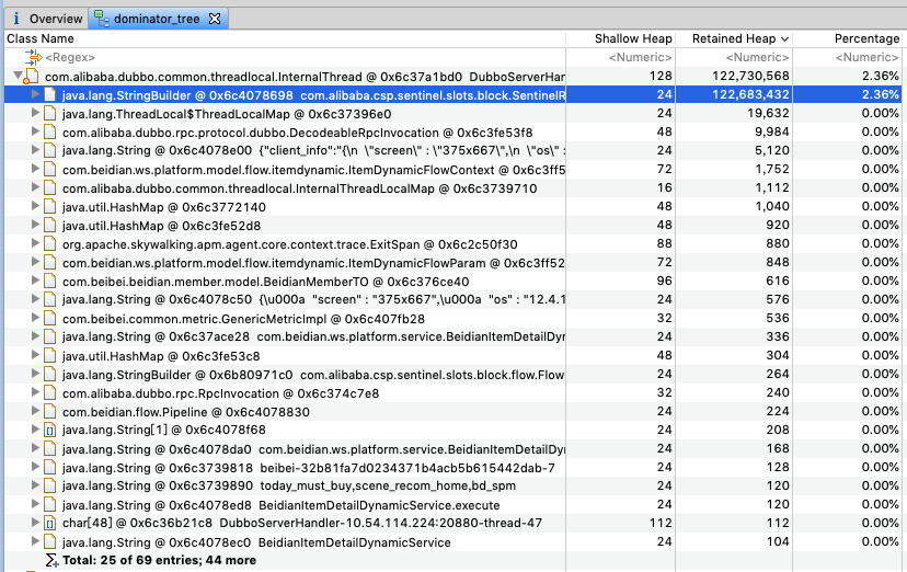 该dubbo线程中存在一个很大的StringBuilder对象,将其值复制出来,发现这个字符串竟然有200MB,其中只有第一行不一样,后面都是重复的字符串。