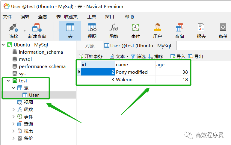 运行程序,然后查看上面创建的数据库,你会看到新建了一张 User 表,并且还添加了几条记录: