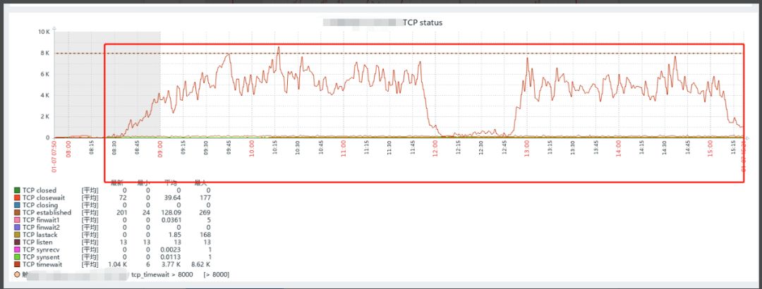 我这边先检查了监控和服务器当前的状态(time_wait连接确实异常):