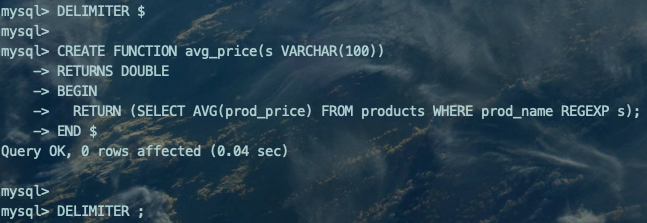 DELIMITER $CREATE FUNCTION avg_price(s VARCHAR(100))RETURNS DOUBLEBEGIN RETURN (SELECT AVG(prod_price) FROM products WHERE prod_name REGEXP s);END $DELIMITER ;