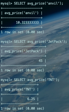 SELECT avg_price('anvil');SELECT avg_price('JetPack');SELECT avg_price('TNT');